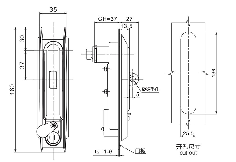 锌合金锁壳,锁芯,手 柄和按钮、带挂扣和防尘盖, 螺母和碳钢钢栓 |